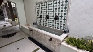 Jose and his wife were in the process of creating an indoor/outdoor oasis. They wanted to add a fountain but also avoid flooding their home. The fountain is located under an open ceiling and requires proper water drainage because it is exposed to all the outdoor elements. The site required a durable yet aesthetically pleasing solution. After reviewing several products, the family chose Vodaland’s Ductile Cast Iron Slotted Drainage solution as well as Vodaland’s Easy TWO – 4” Channel Package.